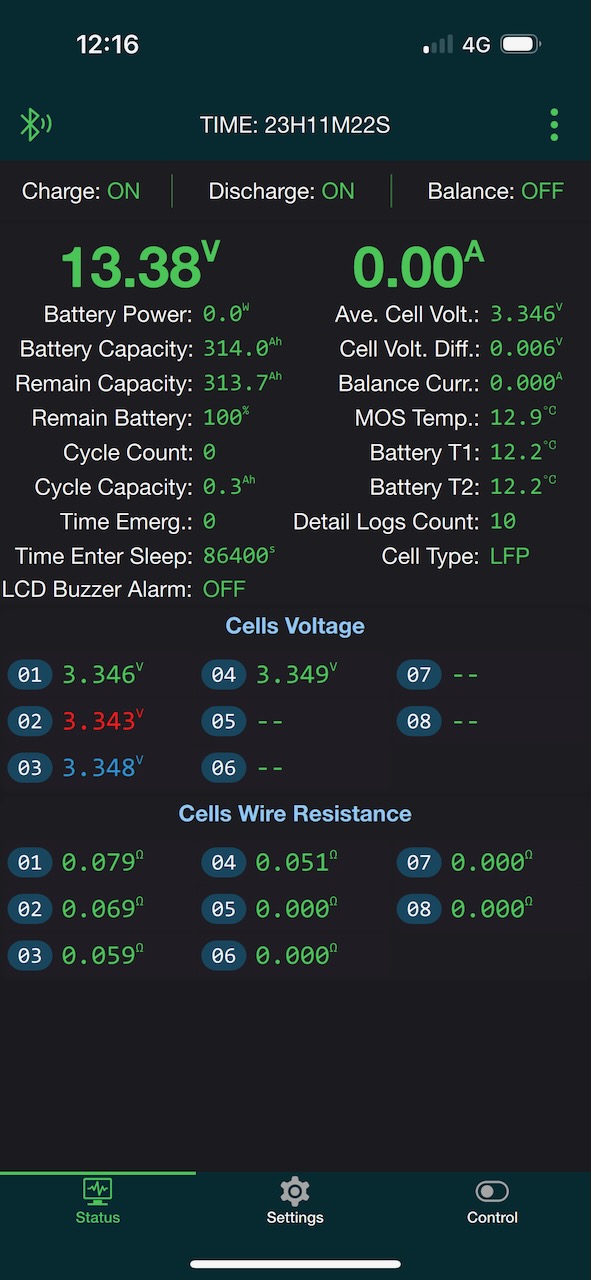 Eventually I got into it and was able to select the LFP battery type and enter the actual capacity of 314Ah. To be fair, the JK BMS app seemed pretty good apart from the out-of-box experience with passwords.