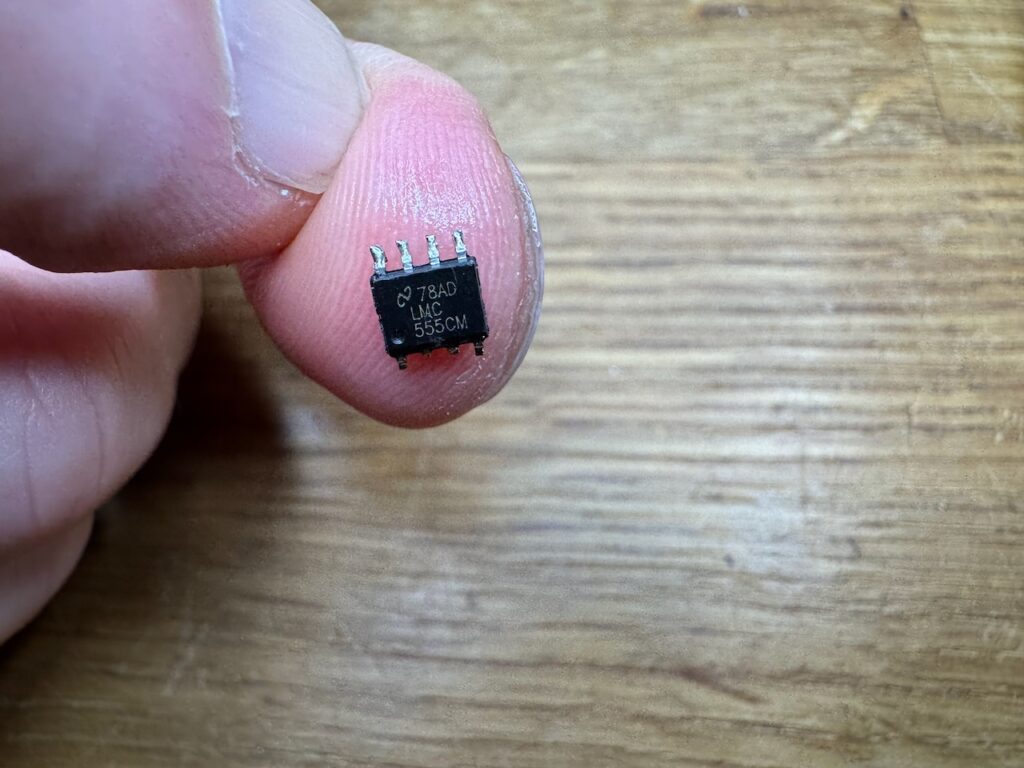 I yeeted the counterfeit chip out of there and substituted a TLC555 (which happened to be the cheapest CMOS 555 timer in Farnell’s online store at £0.66)
