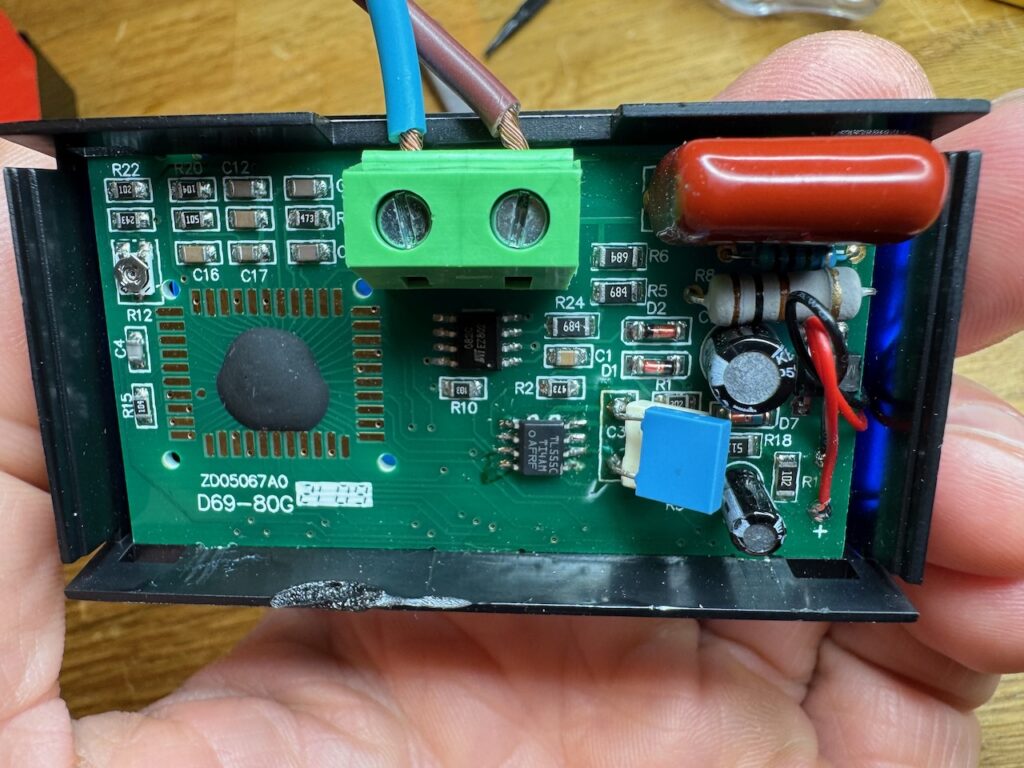 Having done this, R12 was tweaked to read 50.0Hz with a mains frequency input at room temperature. Most Chinese meters I’ve seen so far have a “fortune trimmer” like R12 that can be twiddled to give almost any answer you want. I don’t think I even want to know the tolerance or tempco of this part.